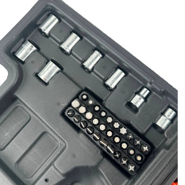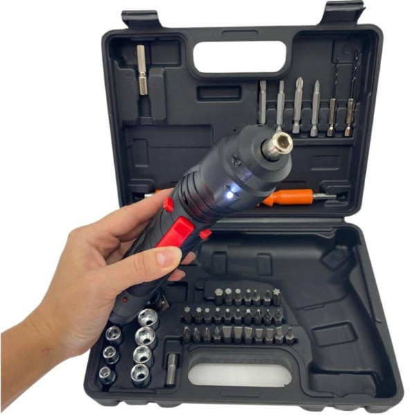 Інструмент обладнаний набором із 48 насадок, що забезпечує максимальну багатофункціональність. Поворотна ручка з кнопкою дає змогу працювати у важкодоступних місцях під будь-яким кутом, а вбудована підсвітка полегшує роботу в умовах низької освітленості.