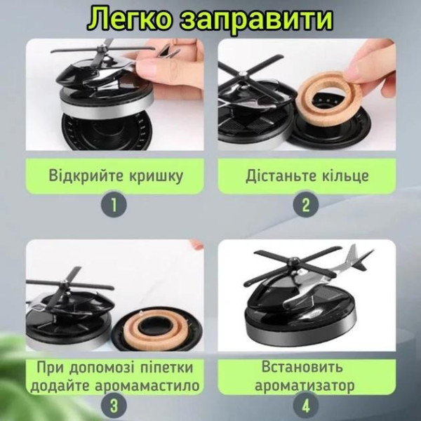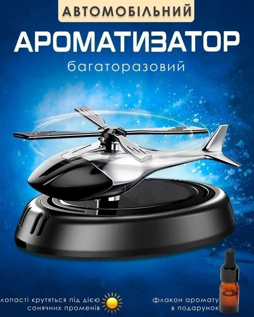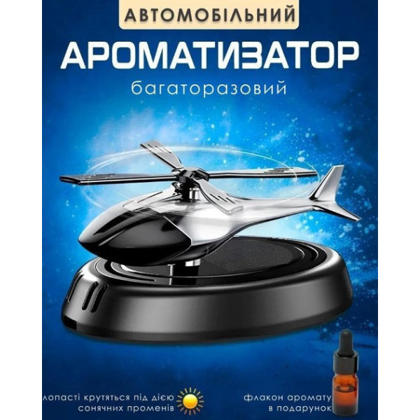 Ароматизатор у формі мінівертолета — стильне та функціональне рішення для автомобіля. Рухомі лопаті вертольота обертаються під впливом сонячного світла, створюючи ефект руху та привертаючи увагу. Ароматизатор кріпиться на панель приладів за допомогою клейкого килимка, який не залишає слідів і легко знімається.