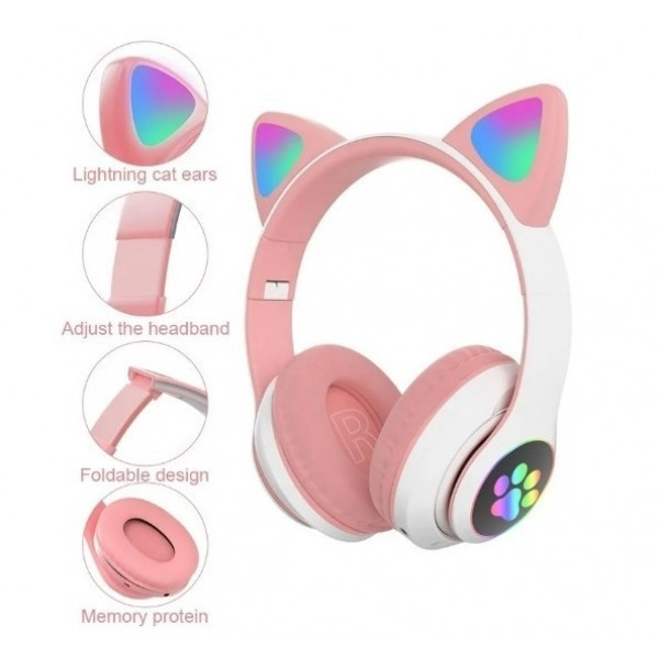 Ці бездротові навушники – новинка для стильних та просунутих дітей, які люблять бути у центрі уваги! Вони виконані з м'якими накладками на вуха для забезпечення максимального комфорту. Матеріали, використані у навушниках, гіпоалергенні та безпечні для дітей, а вихідна потужність суворо відповідає рекомендаціям Всесвітньої організації охорони здоров'я (не більше 85 дБ). Котячі вушка та обід навушників та накладки для вух оснащені RGB-підсвічуванням, що додає стильний акцент.