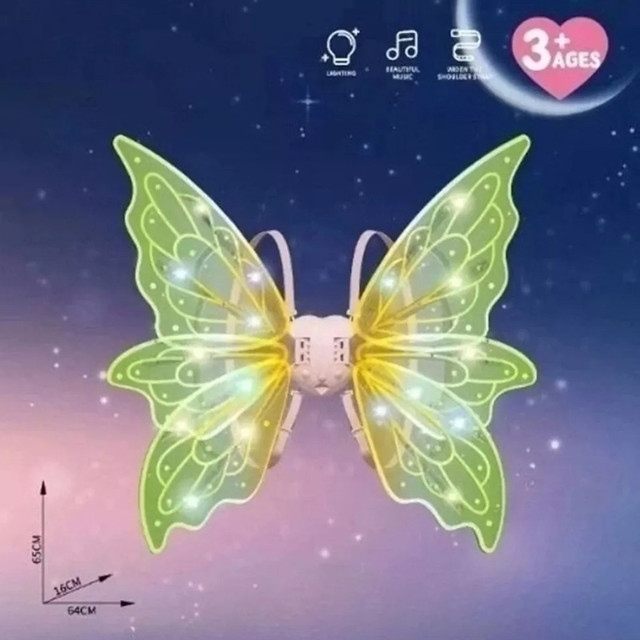 Регульовані ремінці забезпечують надійну фіксацію на спині та підходять дітям від 3 років. Просте збирання й інструкція дають змогу швидко підготувати крила до використання. Два режими роботи — тільки підсвітка або підсвітка з музикою — додають чарівництва та роблять аксесуар особливо привабливим для малюків.