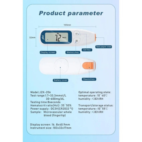 Електронний глюкометр JZIKI JZK-206 AND 5315 — це пристрій для точного та швидкого вимірювання рівня глюкози в крові. Компактний дизайн, зручний інтерфейс і висока точність роблять його незамінним помічником для щоденного контролю діабету та профілактики захворювань.