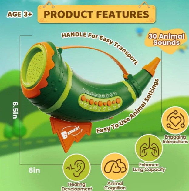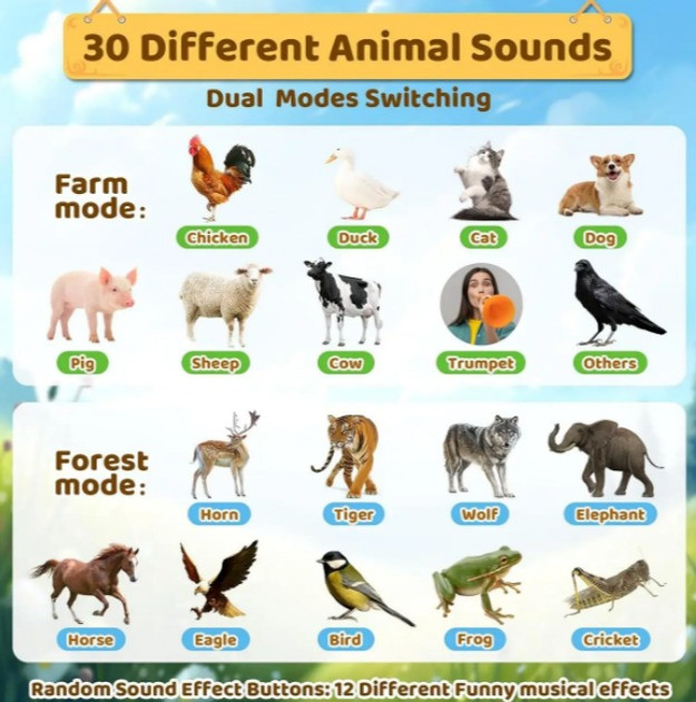 - 30 звуків тварин: Відтворює різноманітні звуки, включно зі щебетанням птахів, рівом хижаків та іншими природними звуковими ефектами.