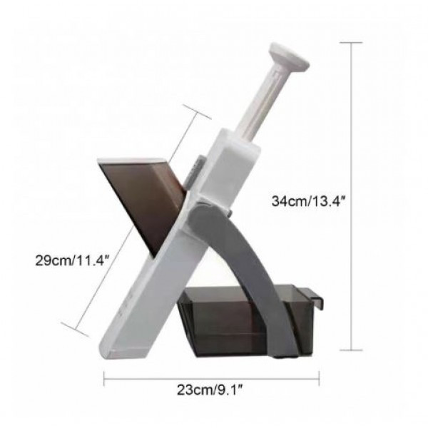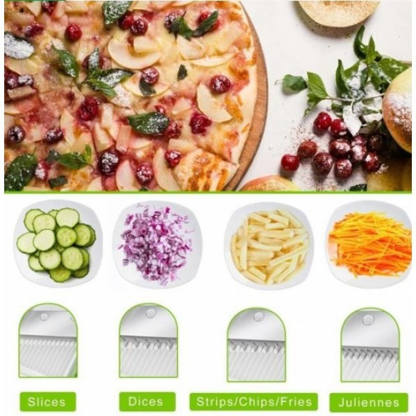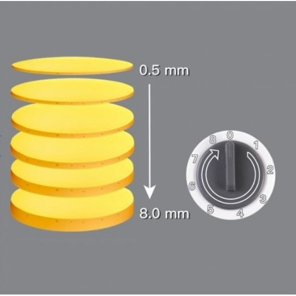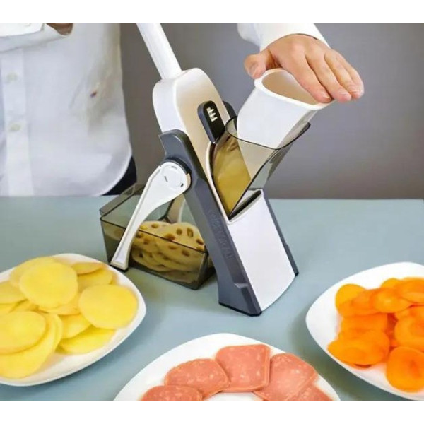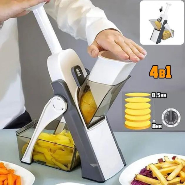 Слайсер обладнаний містким завантажувальним отвором, безпечним штовхачем і контейнером для готових інгредієнтів. Товщина нарізки регулюється від 0,5 до 8 мм, що дає змогу готувати салати, закуски та гарніри в різних стилях.