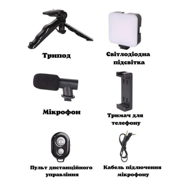 Комплектація: трипод, мікрофон, LED-підсвітка, тримач смартфона, Bluetooth-кнопка