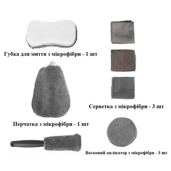 Комплектація містить рукавичку для мийки, губку, трикотажний рушник, серветку для скла, вафельну сітку, три рушники та щітку для автомобільних шин. Такий асортимент дає змогу виконати як зовнішній догляд за кузовом, так і прибирання в салоні.