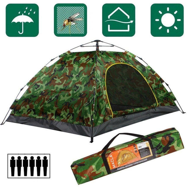 Намет автоматичний 6-місний Камуфляж 2х2.5 м — ідеальний вибір для кемпінгу, відпочинку на природі та риболовлі. Завдяки технології саморозкладання установлення займає всього кілька секунд: досить дістати намет із чохла та розправити.