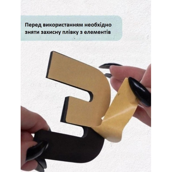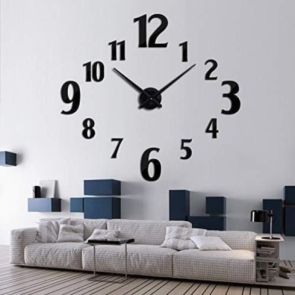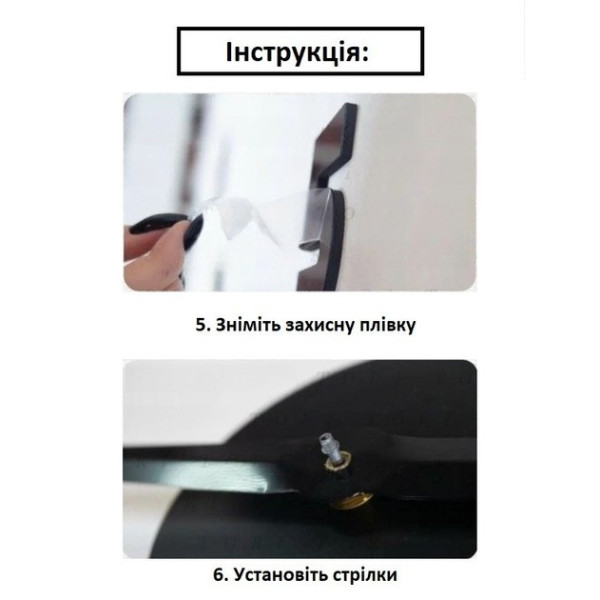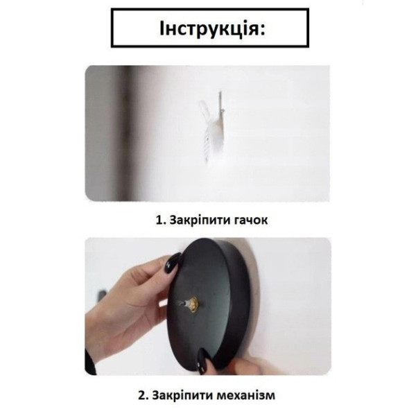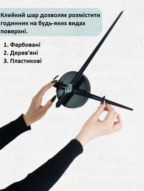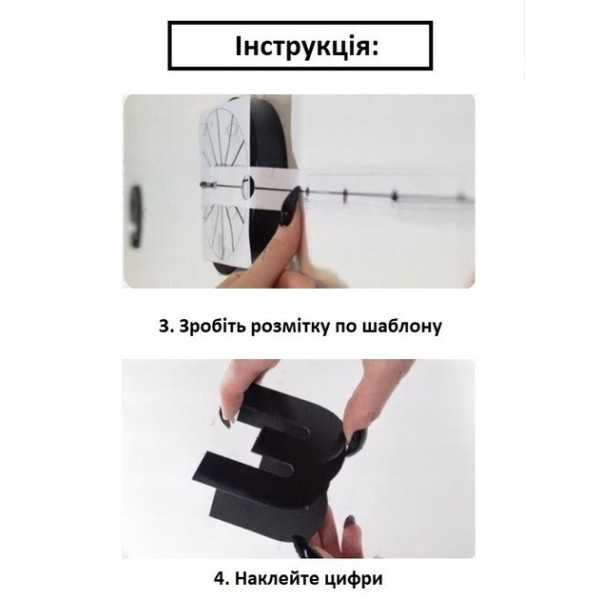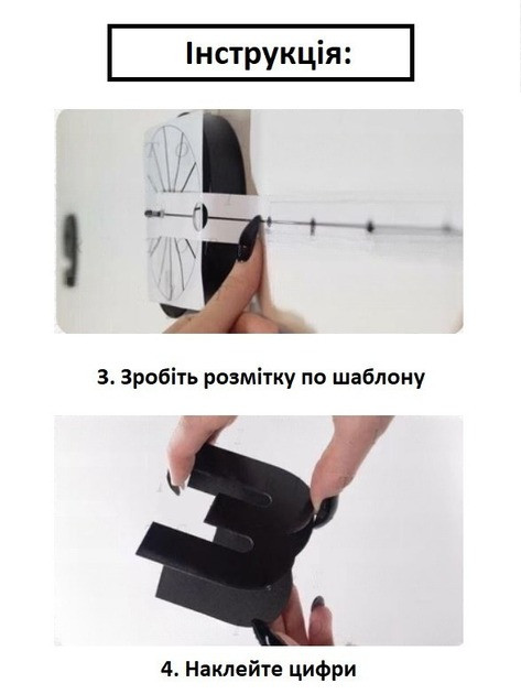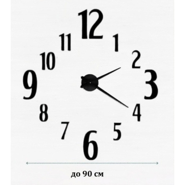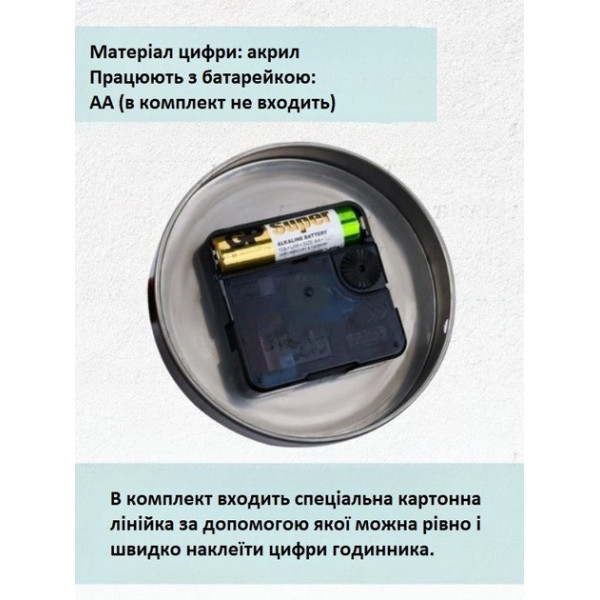 Безшумний годинниковий механізм забезпечує комфортне використання без зайвого шуму. Самоклейні акрилові цифри легко кріпляться на стіну, а шаблон для розмітки допомагає точно встановити цифри та стрілки, підбираючи оптимальний розмір годинника — від 70 до 90 см у діаметрі.