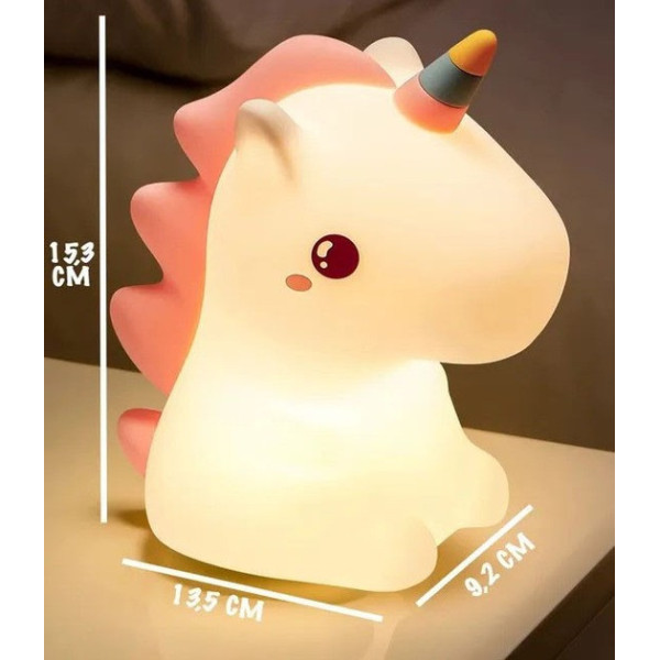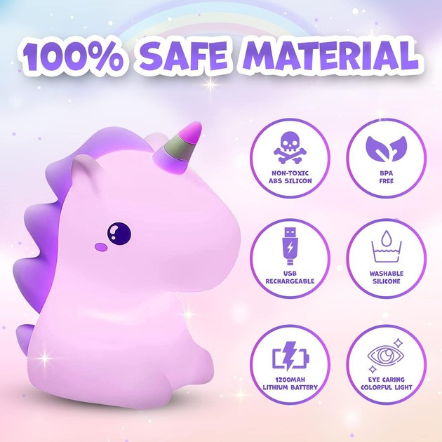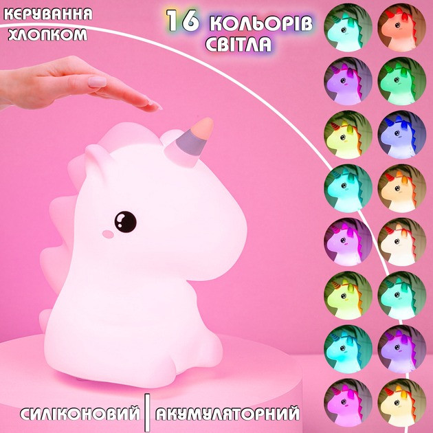 Чарівний нічник у формі єдинорога стане улюбленим світловим орієнтиром для вашої дитини. М'яке світло створює атмосферу казковості, затишку та безпеки, не подразнює очі та повністю безпечний для дітей. Нічник виготовлений із гіпоалергенного силікону, приємного на дотик, а сенсор реагує на бавовни та стиснення, даючи змогу змінювати інтенсивність і колір підсвітки за бажанням.