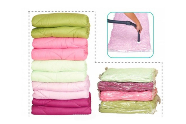 Вакуумні мішки для зберігання речей допоможуть збільшити простір завдяки їхній головній перевагі: через герметичність упаковки речі, складені в пакет, щільно стискаються та їх обсяг зменшується до 75%.