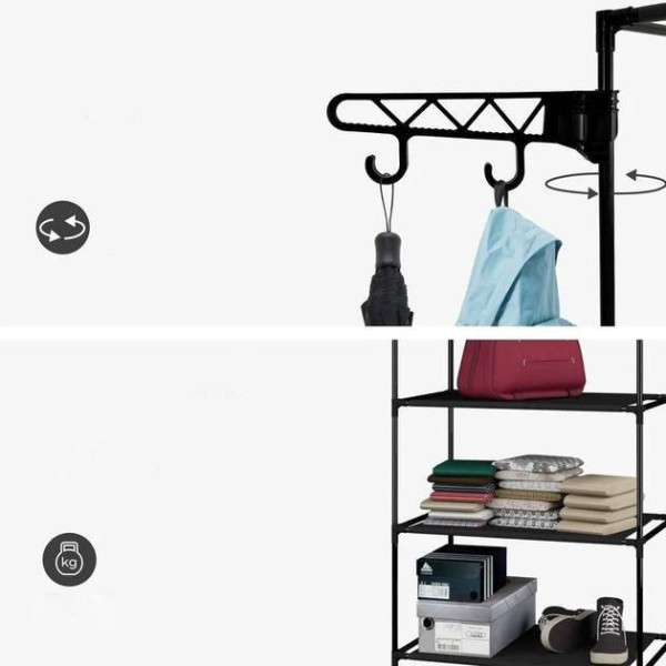 Багаторівнева конструкція містить гачки для верхнього одягу та сумок, полиці для взуття, текстильні відділення для зберігання білизни, рушників та інших дрібниць. Поворотний гачок на 360° забезпечує легкий доступ до всіх речей. Вішалка стійка до вологи та підходить для використання в різних приміщеннях.