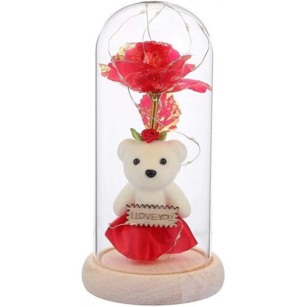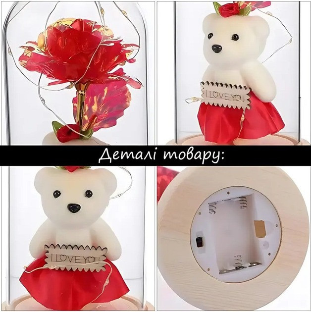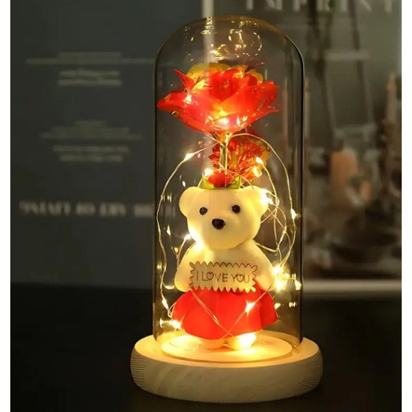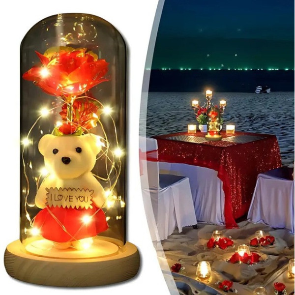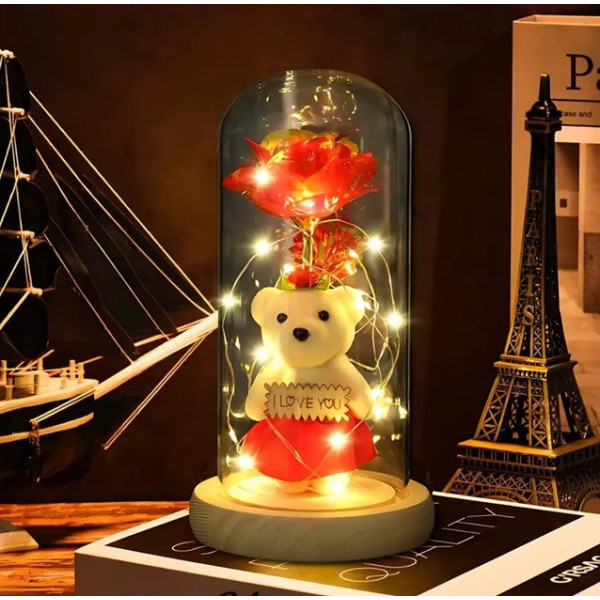 Нічник "I Love You" — це поєднання світла, затишку та декоративної чарівності. У скляній колбі міститься ведмедик і вічна троянда, а м'яка LED-підсвітка створює приємне приглушене освітлення, яке підходить для читання, відпочинку або романтичної атмосфери.