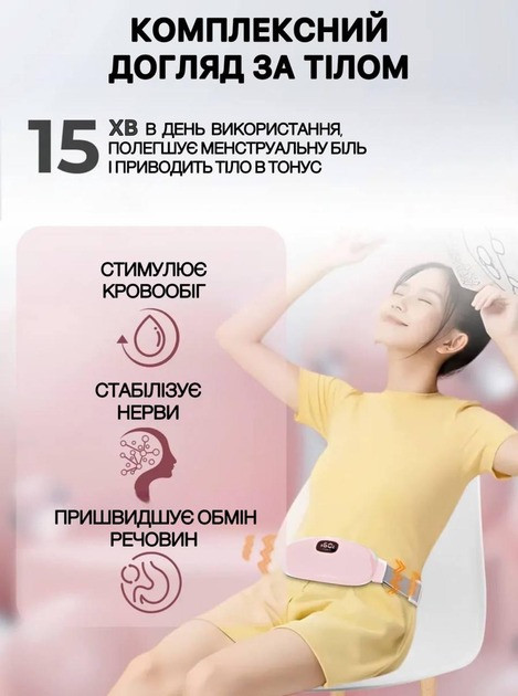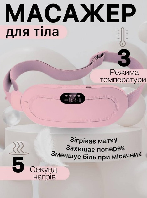 Портативний розумний пояс-грейка з вібраційним масажем створений для зняття дискомфорту та напруження в зоні талії й живота. Він ефективно прогріває м'язи та м'яко масажує, полегшуючи спазми та менструальні болі.