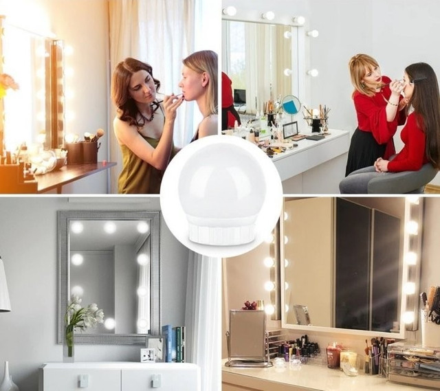 Всі лампочки з набору кріпляться на двосторонній скотч (який йде в комплекті) і міцно монтують кожну лампочку на будь-якому дзеркалі або інших поверхнях.