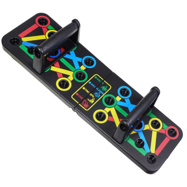 Колірна розмітка на платформі допомагає правильно встановити упори для роботи з різними групами м'язів: червоний — груди, синій — плечі, зелений — спина, жовтий — руки. Дошка виготовлена з міцного АБС-пластику та легко складається, перетворюючись на компактний «валізатор» для зберігання або перенесення. Для тренування потрібна лише рівна поверхня. Після занять платформа легко очищається вологою ганчіркою.