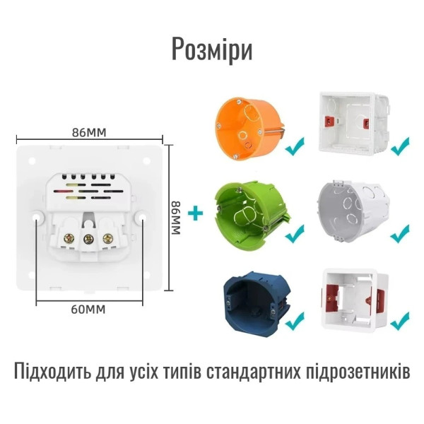 Просте встановлення: кріплення до стандартного підрозетника за допомогою гвинтів або лапок.