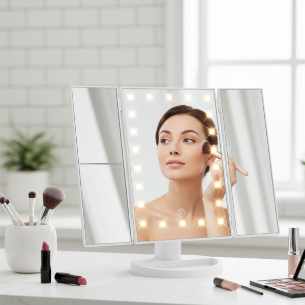 Зеркало идеально подходит для макияжа и ухода за лицом в любом месте при любом освещении. Лёгкое и мобильное. Правильное освещение лица со всех сторон, позволит вам равномерно нанести косметику, не допуская ошибок.