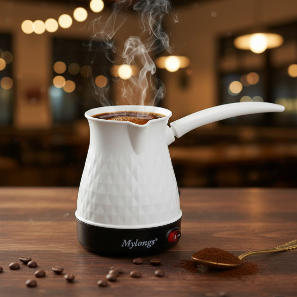 Электрическая турка (кофеварка) Mylongs KF-011 - незаменимое приобретение для любителей кофе. Благодаря ее компактным размерам, Вы можете наслаждаться кофе не только дома, но и в путешествиях, на даче или на работе. Достаточно подключить ее к сети, насыпать кофе и залить воду. Через пару минут бодрящий ароматный напиток будет готов.