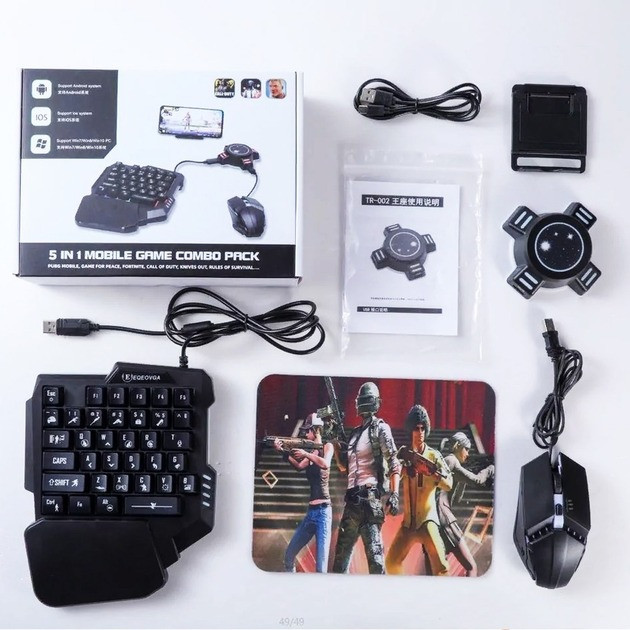 Игровой комплект MOBILE GAME COMBO PACK 5в1 создан для комфортного и точного управления мобильными играми и ПК. Набор включает мембранную клавиатуру с мягким ходом клавиш и RGB статической подсветкой, проводную мышь с динамической подсветкой и разрешением до 6400 DPI, а также хаб с USB и Type-C портами для подключения устройств.