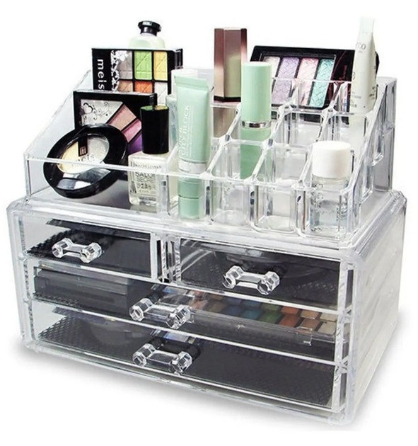 Прозрачный пластик позволяет легко и быстро находить нужную косметику и аксессуары, а нейтральный дизайн впишется в любой интерьер.