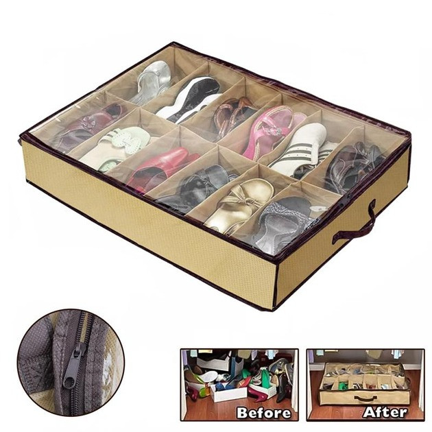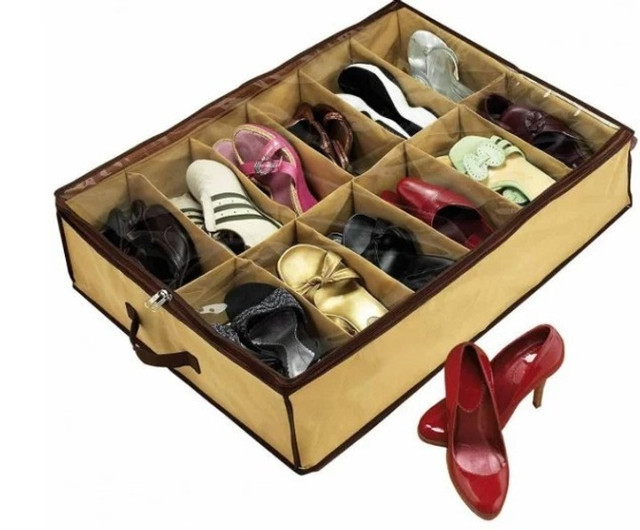Органайзер для обуви Shoes Under, в отличие от обувных коробок больших размеров, Ви можете спрятать его в шкафу или по кроватью.