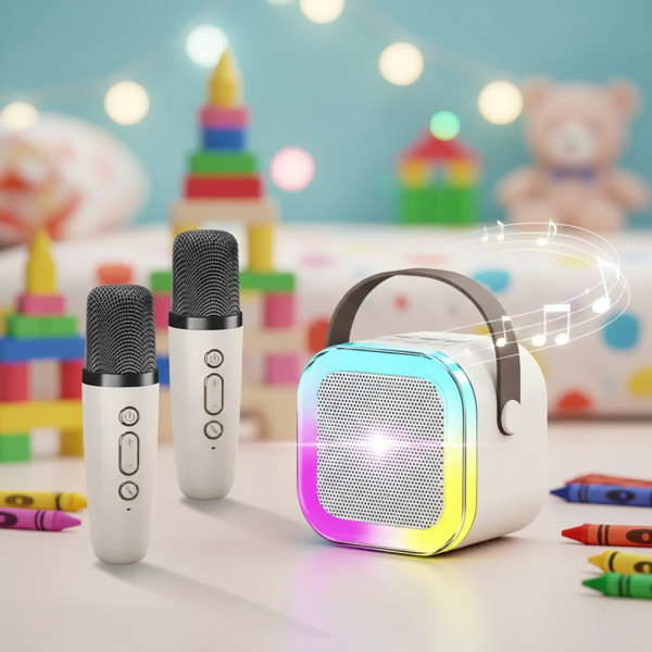 Эта портативная колонка предоставляет отличное развлечение для караоке с удобными функциями и стильным дизайном. В комплекте поставляются два беспроводных микрофона, что делает ее идеальным выбором для веселых вечеринок и музыкальных выступлений.