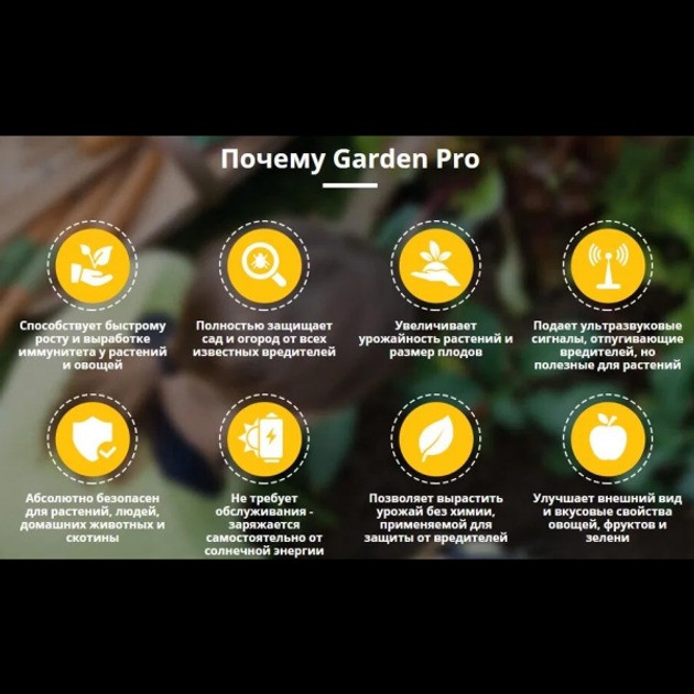 Отпугиватель насекомых и грызунов Garden Pro на солнечной батарее укрепляет растения Зеленый - прибор, предназначенный для работы в огороде с растениями, который защищает их от вредителей и предотвращает появление болезнетворных микроорганизмов и бактерий.