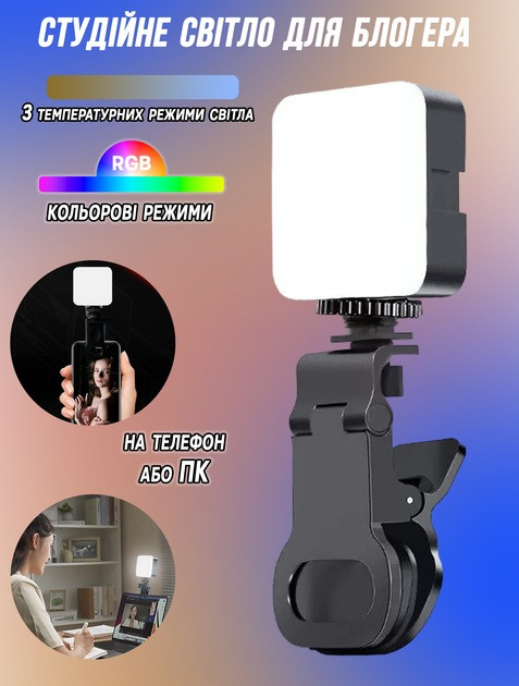 Міні студійне світло WOW AY83-RGB — компактний і універсальний освітлювальний прилад для блогерів, фотографів і стримерів. Модульна конструкція дає змогу встановлювати світло на мобільний телефон, планшет, монітор, ноутбук за допомогою прищіпки, а також на фотоапарат або штатив через нарізне з'єднання. Кілька модулів можна з'єднувати між собою для посилення освітлення або створення комбінованих світлових ефектів.