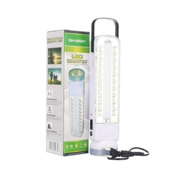 Акумуляторний Ліхтар GH-6661 — це лампа, призначена для освітлення у квартирі, на дачі, на вулиці та в умовах походу, якщо немає електроенергії від загальної мережі. Заряджається від мережі 220 В, через DC-роз'єм 5 В або від сонячної батареї. Ліхтар має спрямоване LED-світло й бічну комбіновану лампу (SMD + LED), які дають дуже гарне освітлення. Є висувна ручка для підвішування та транспортування лампи, також можливе встановлення у вертикальному положенні для використання як настільної лампи.