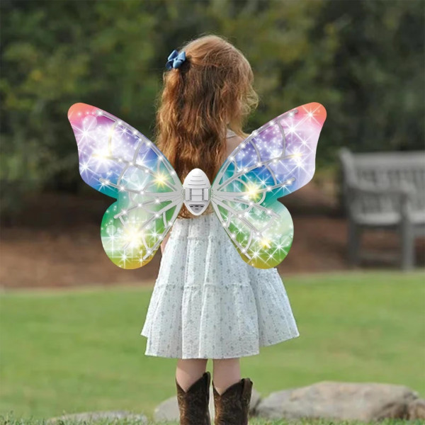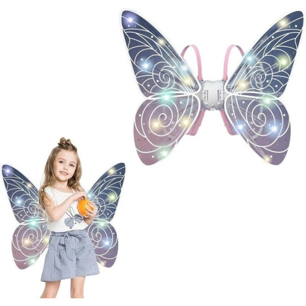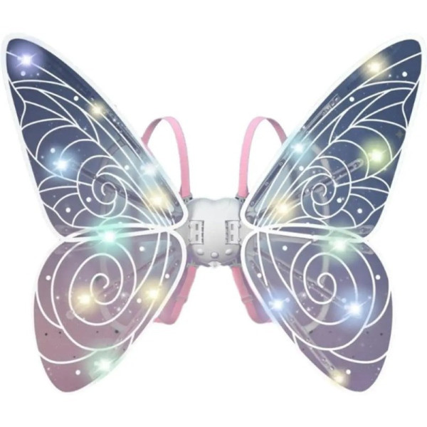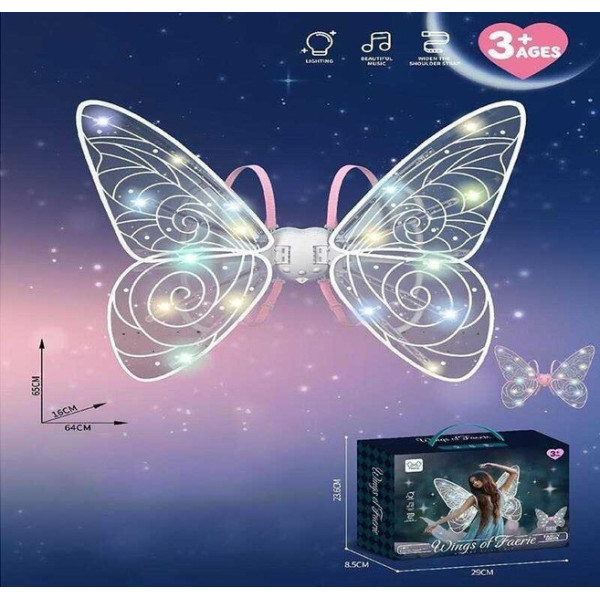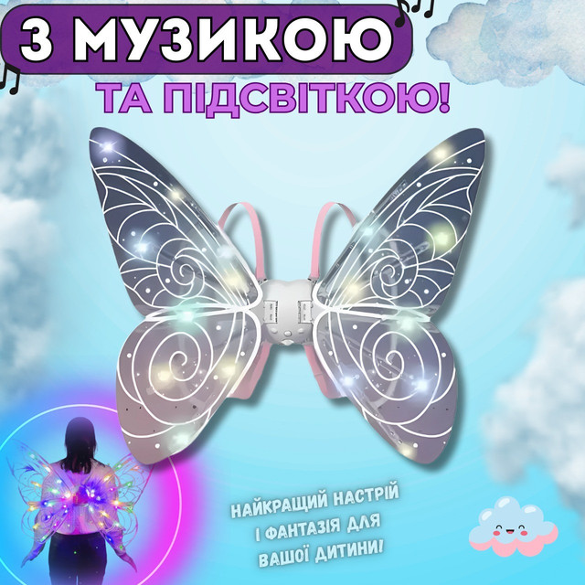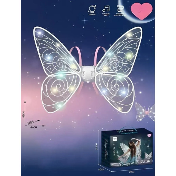 Крила виготовлені у формі метелика, мають зручні регульовані ремені для надійної та комфортної посадки. Легкі та безпечні матеріали дають змогу носити аксесуар довго, не втомлюючись. Два режими роботи дають можливість вмикати підсвітку з музикою або тільки світло.