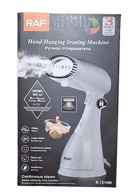 RAF R-1214W 300 мл White — ідеально підходить для подорожей або домашнього використання. Легко розпрасовуйте складки на одязі, коли вона лежить на вішаках.