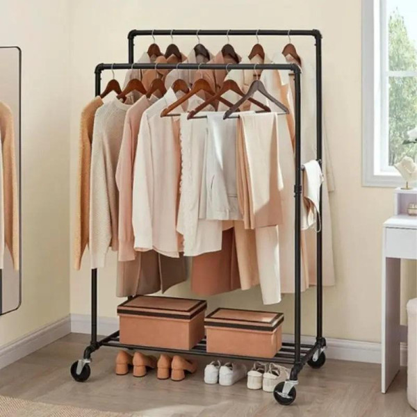Пересувна підлогова вішалка Bodasan 9108 — практичне рішення для зберігання одягу вдома, у гардеробній або магазині. Подвійна конструкція з двома штангами дає змогу розвішувати більше речей, а полиця під штангами забезпечує додаткове місце для взуття, аксесуарів або сумок.