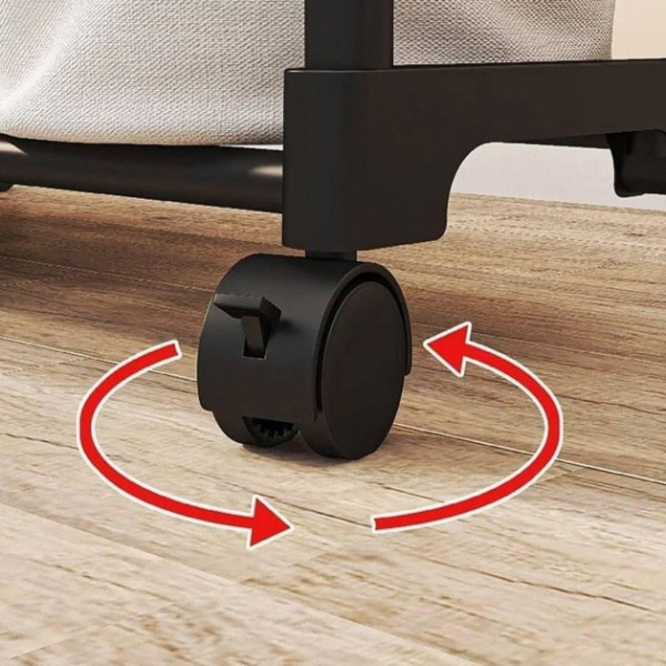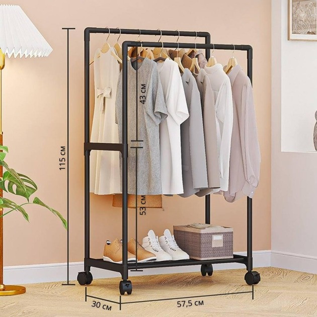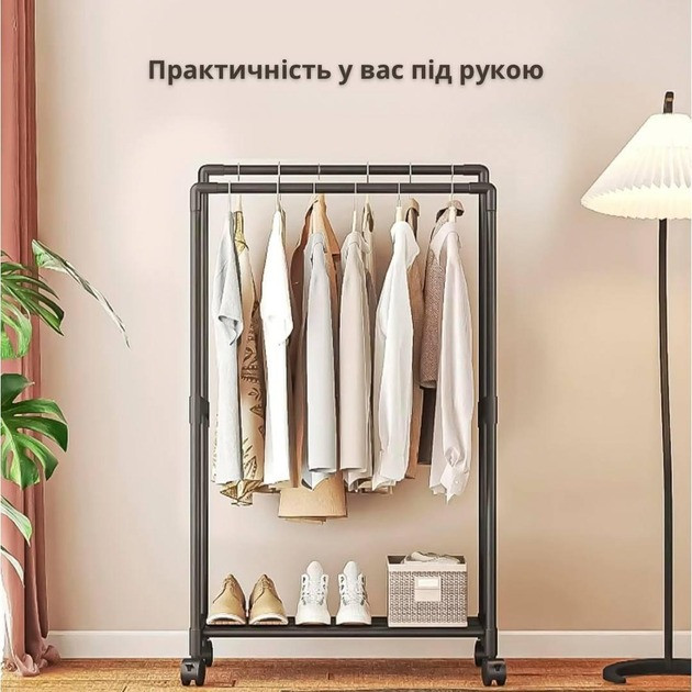 Вішак обладнаний коліщатками, що робить його мобільним і зручним під час перестановки або прибирання. Телескопічна конструкція дає змогу за потреби регулювати висоту штанг, а чорний метал у поєднанні з пластиковими елементами забезпечує міцність і стиль.