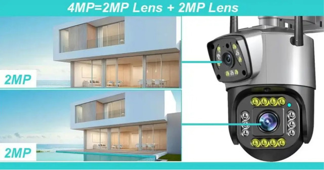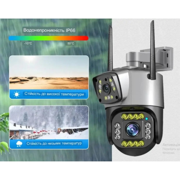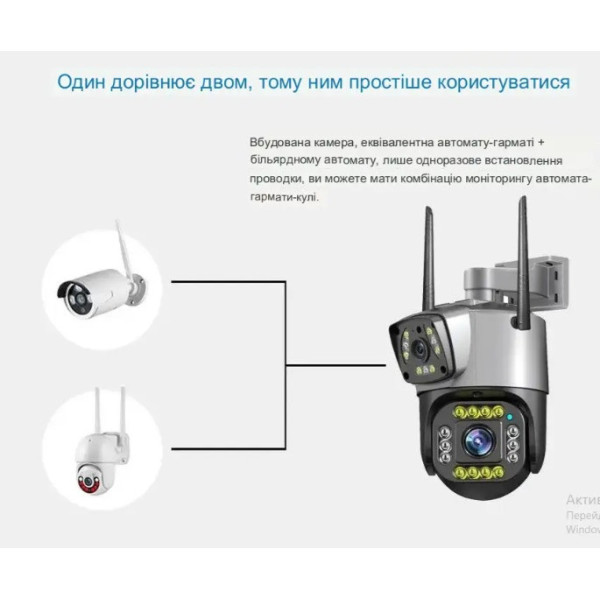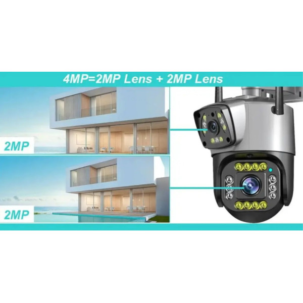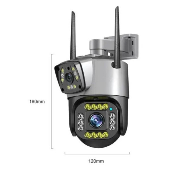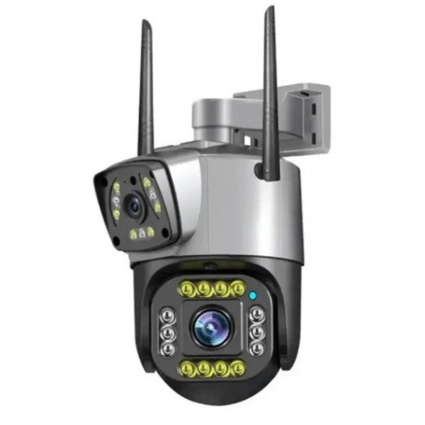 IP-камера V380 — це універсальне рішення 2-в-1 для професійного відеоспостереження. Завдяки наявності двох незалежних об'єктивів пристрій здатний одночасно контролювати два різні сектори. Верхня камера встановлена на фіксованій основі, а нижня — поворотна з функцією PTZ (панорамування, нахил, зум), що дає змогу замінити відразу дві стандартні камери.