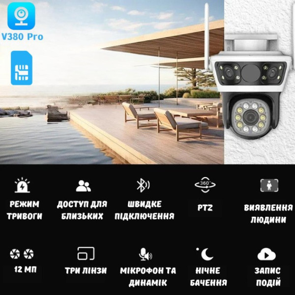 Камера підтримує Wi-Fi, LAN и 4G, що робить її універсальною для встановлення в будь-яких умовах: вдома, на дачі, в офісі або на складі. Під'єднання до програми V380 Pro дає змогу керувати пристроєм віддалено, отримувати повідомлення про рух і переглядати відеопотік у реальному часі з телефона.